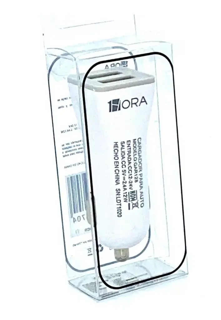 Cargador básico USB para coche de 12 W para dispositivos universales. Fabricado en PC+ABS con diseño de enchufe compacto.
